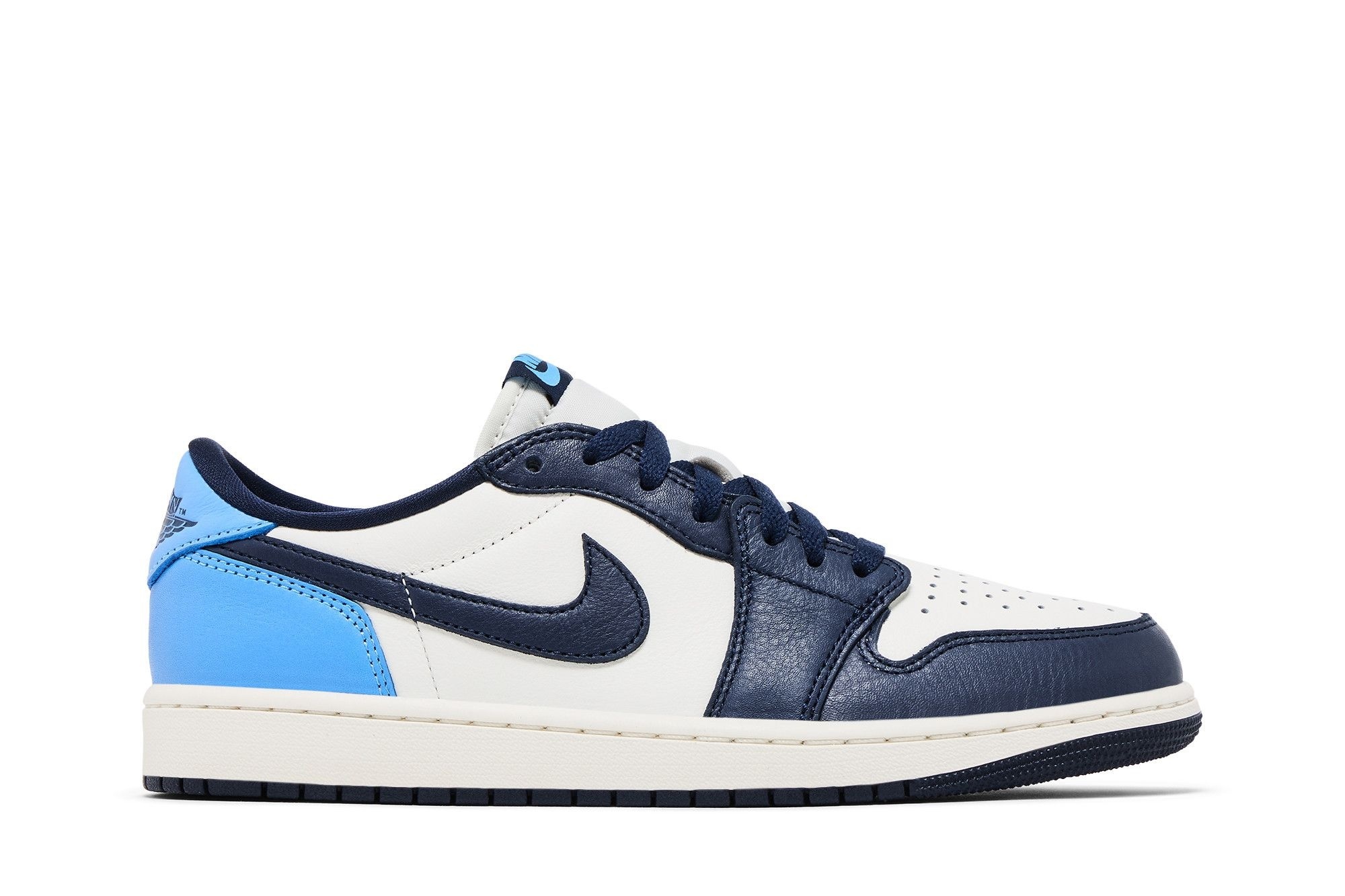 Jordan Air Jordan 1 Low OG Obsidian UNC (CZ0790-400). Premium leather sneakers in Obsidian/University Blue/Sail. Iconic design, Air-sole cushioning, durable construction. Classic style for everyday comfort.