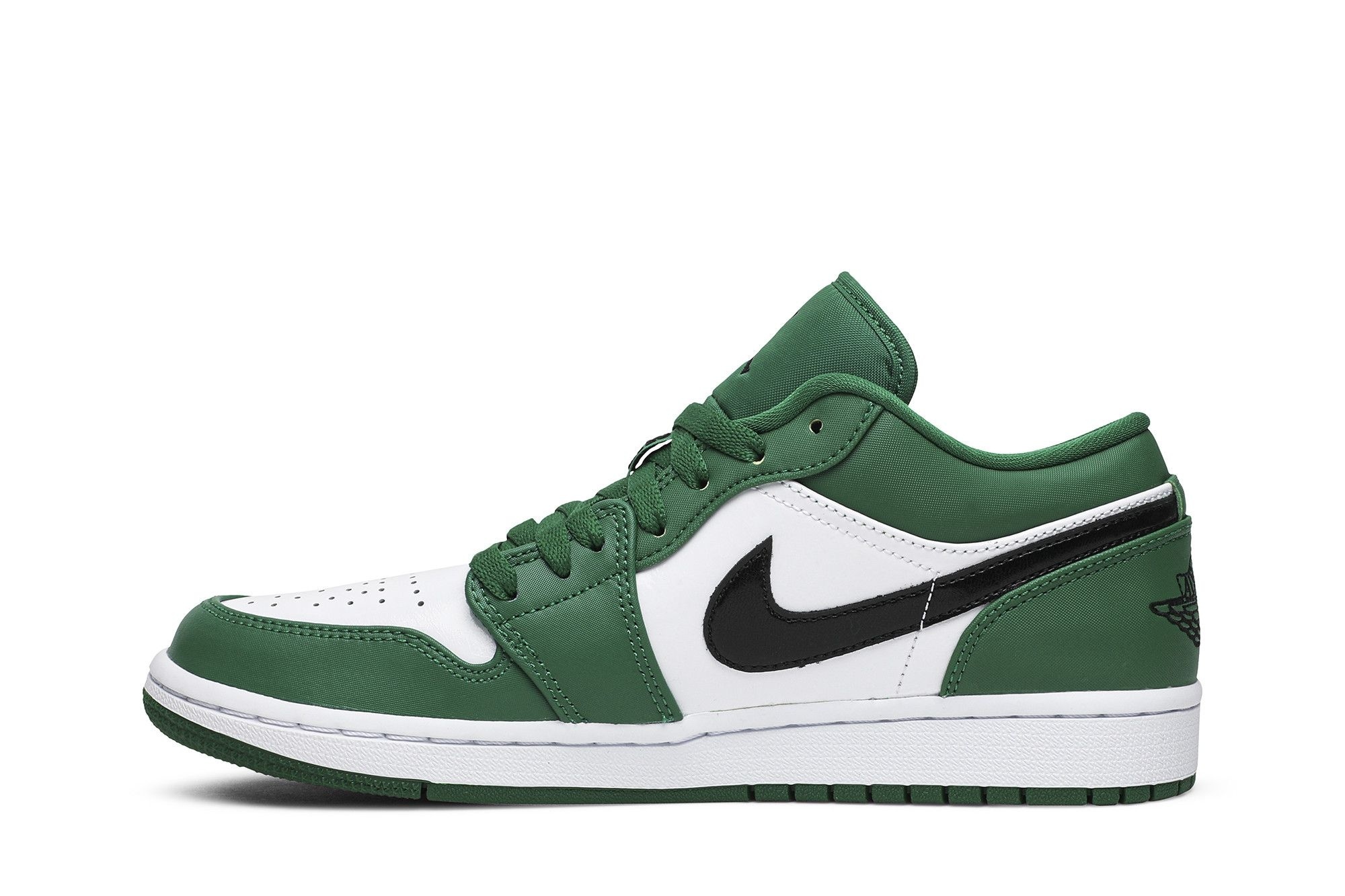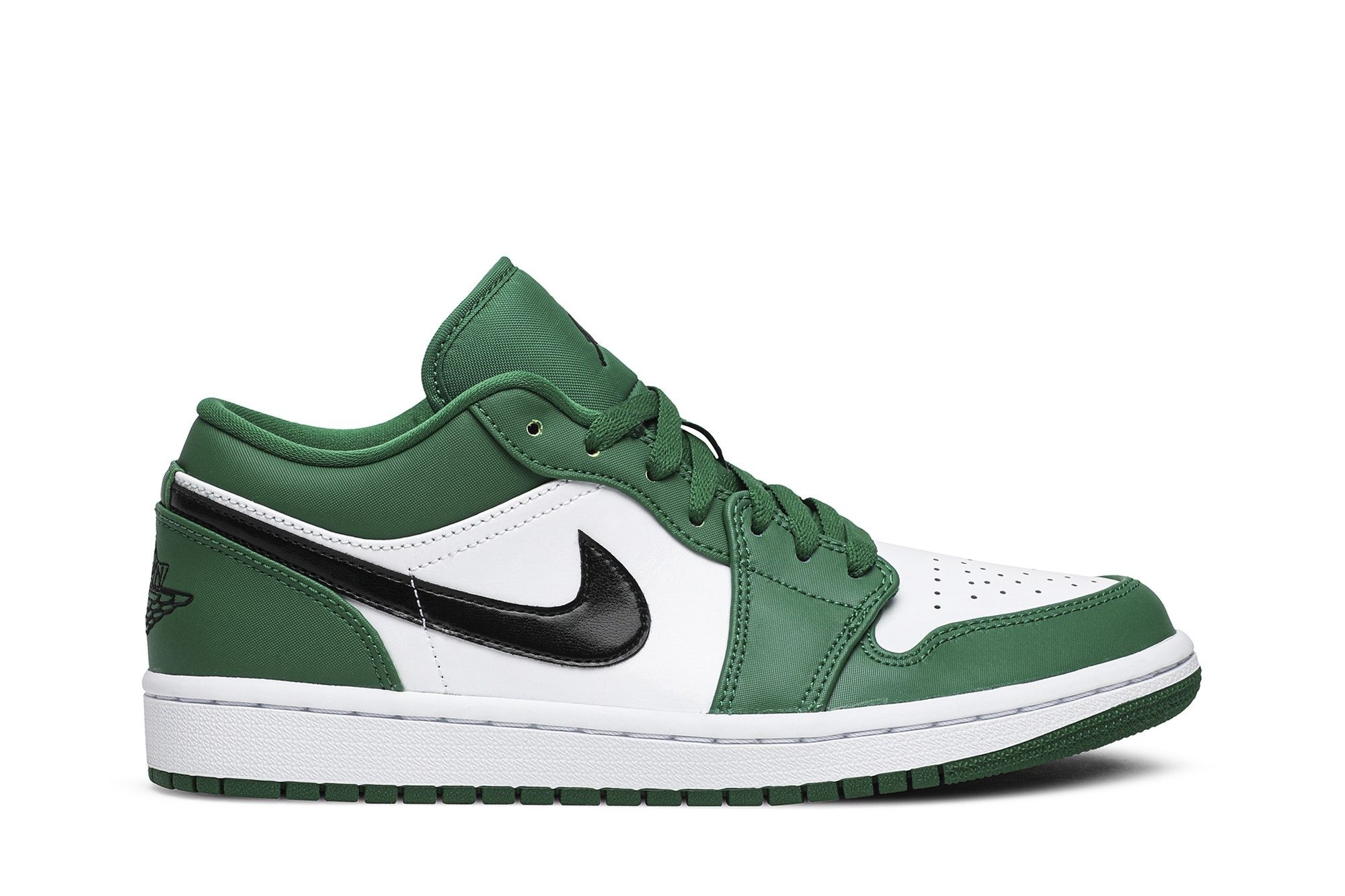 Classic Jordan 1 Low Pine Green sneakers (553558-301). Premium leather, Pine Green/Black-White colourway. Comfortable & versatile, perfect for everyday style. A timeless Air Jordan design.
