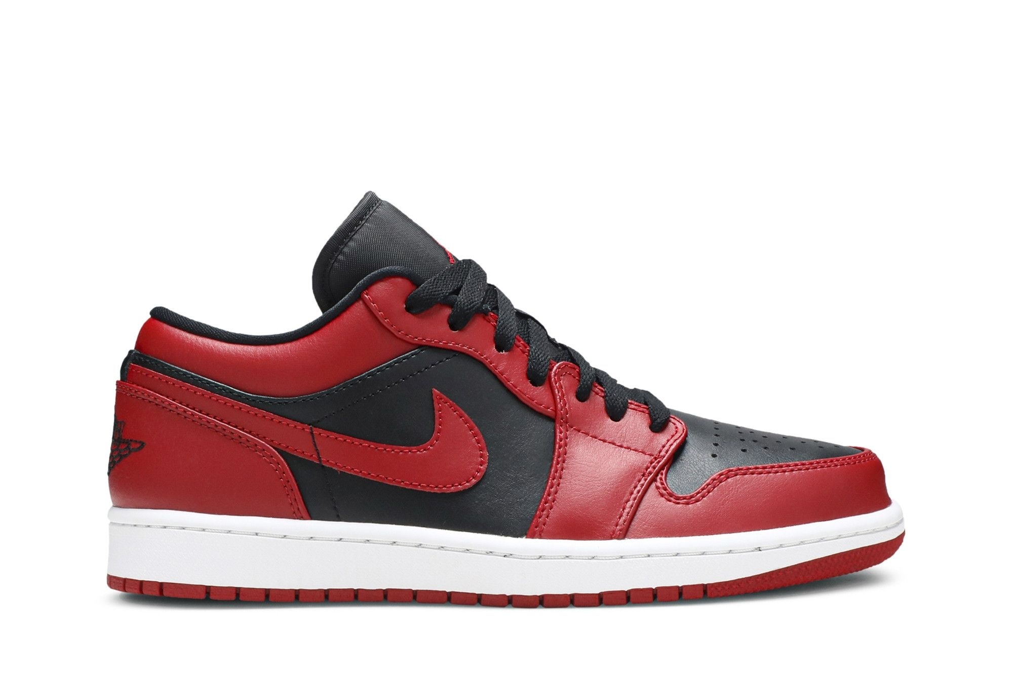 Iconic Jordan 1 Low Reverse Bred (553558-606) sneakers. Gym Red/Black/White colourway. Premium leather, comfortable low-top design. Perfect for everyday wear. Classic Jordan branding.