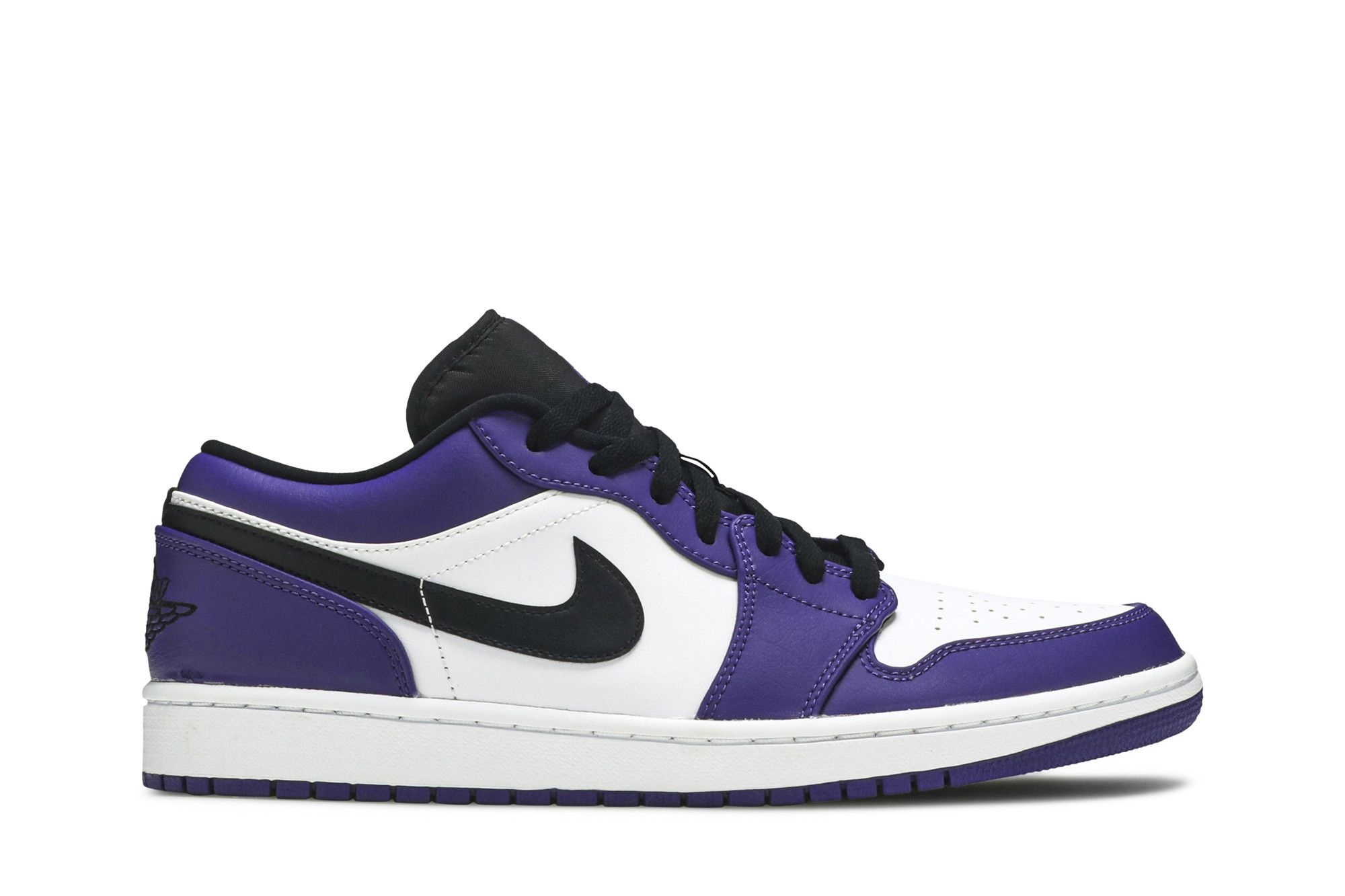 Jordan Brand Air Jordan 1 Low (553558-500) Court Purple/White sneakers. Iconic low-top design, premium leather, Air-Sole cushioning, and versatile style. Released November 2020.