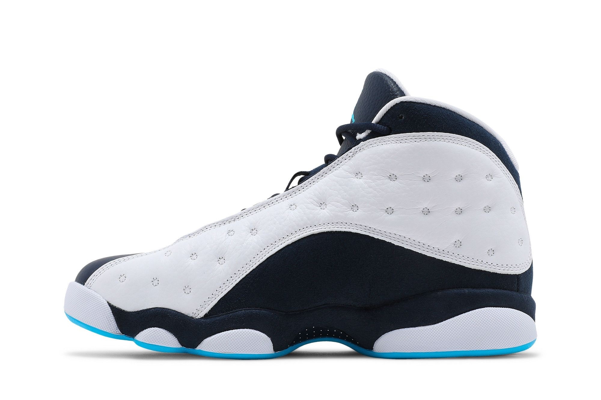 Air Jordan 13 Retro Obsidian Powder Blue White (414571-144). Premium leather, iconic holographic Jumpman, and comfortable cushioning. A stylish blend of classic and modern design. Originally released September 2021.