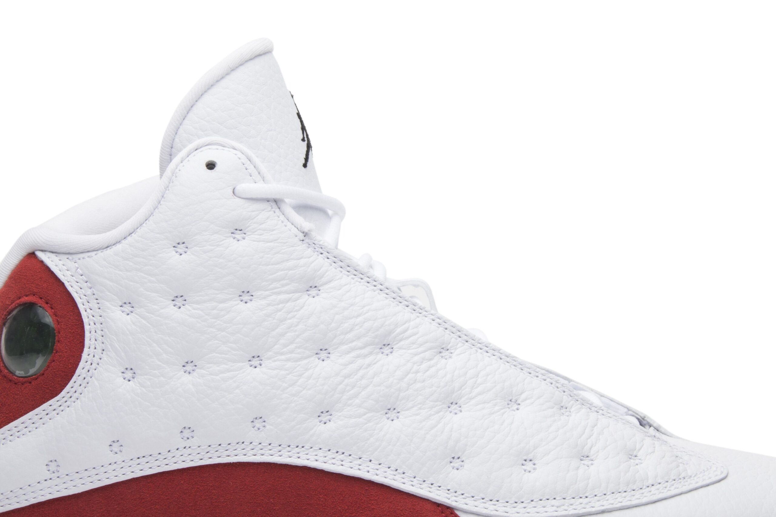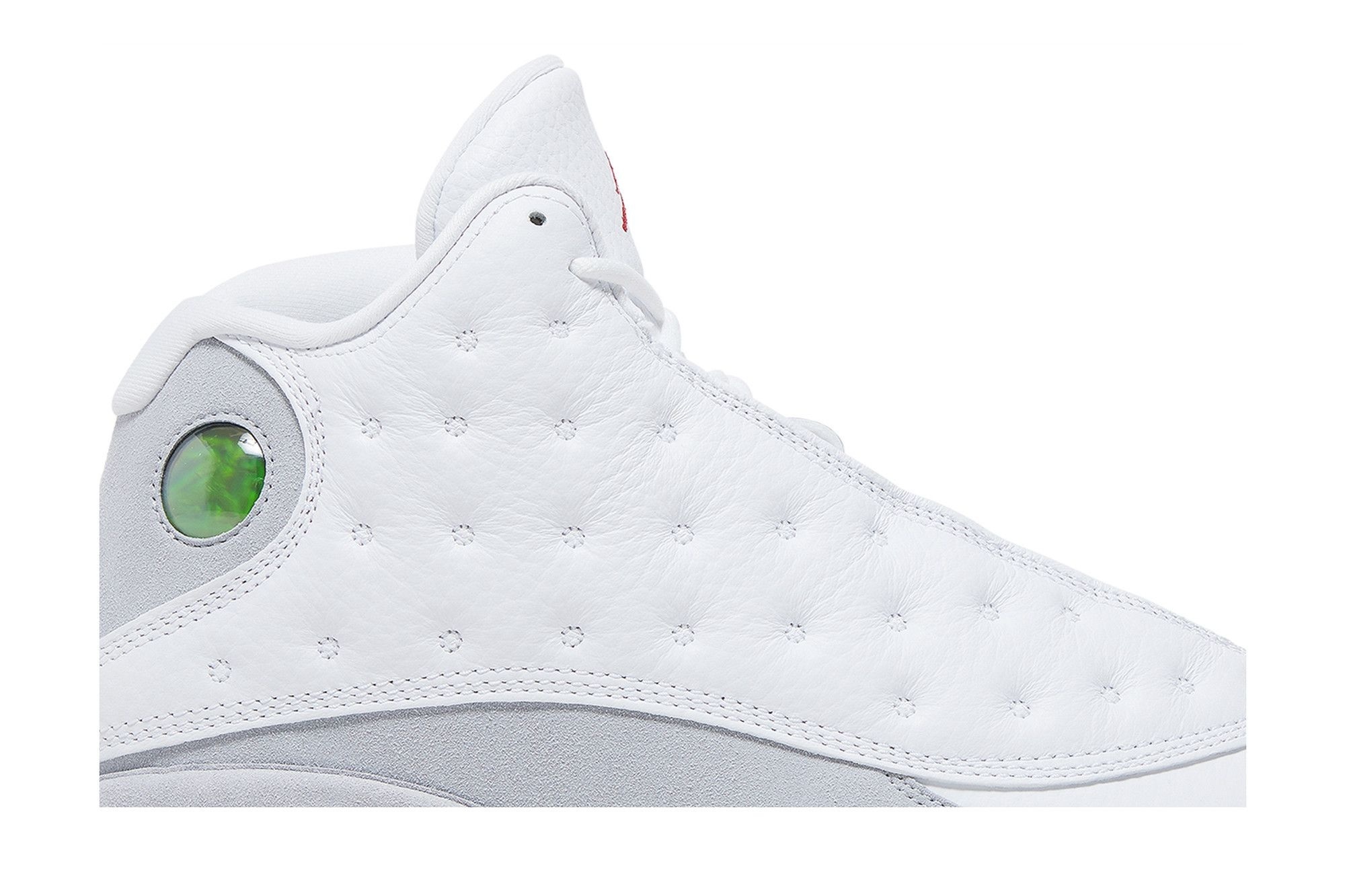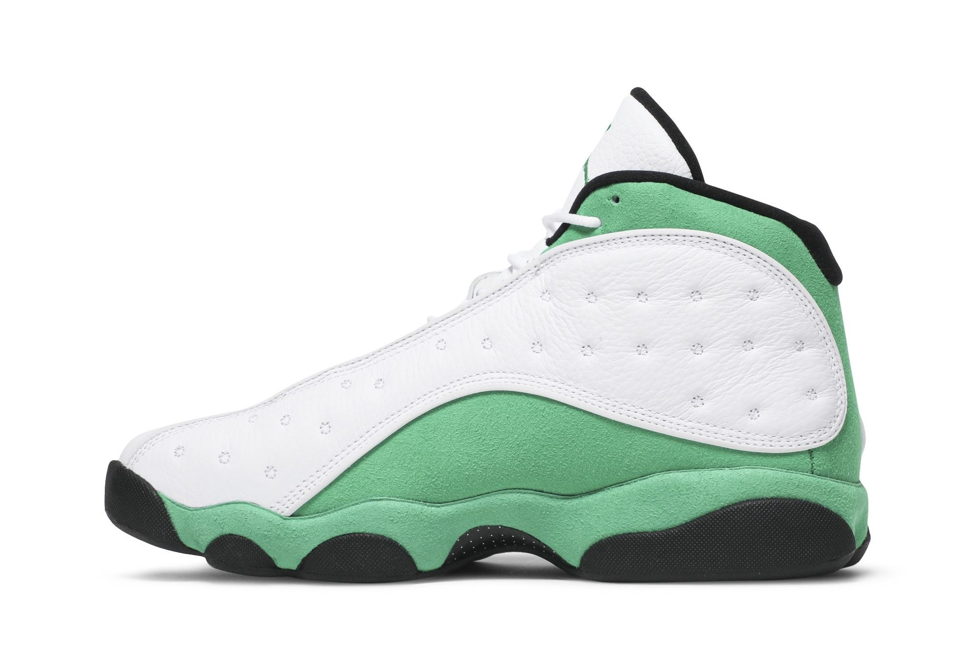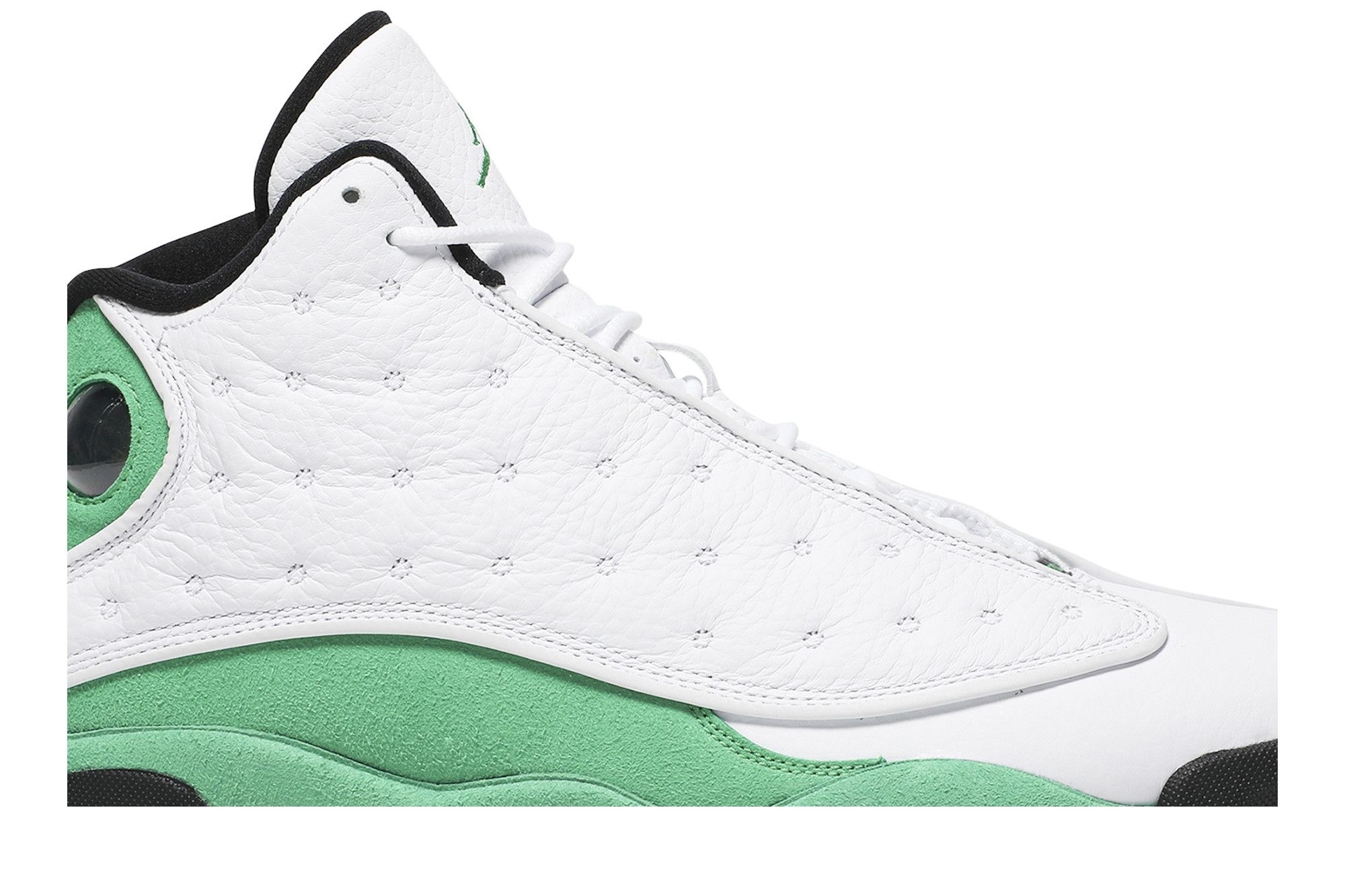 Jordan Brand Air Jordan 13 Retro Lucky Green (DB6537-113). White leather upper with green suede overlays. Iconic Jumpman logo & reflective details. Premium comfort & style. A must-have for sneakerheads.