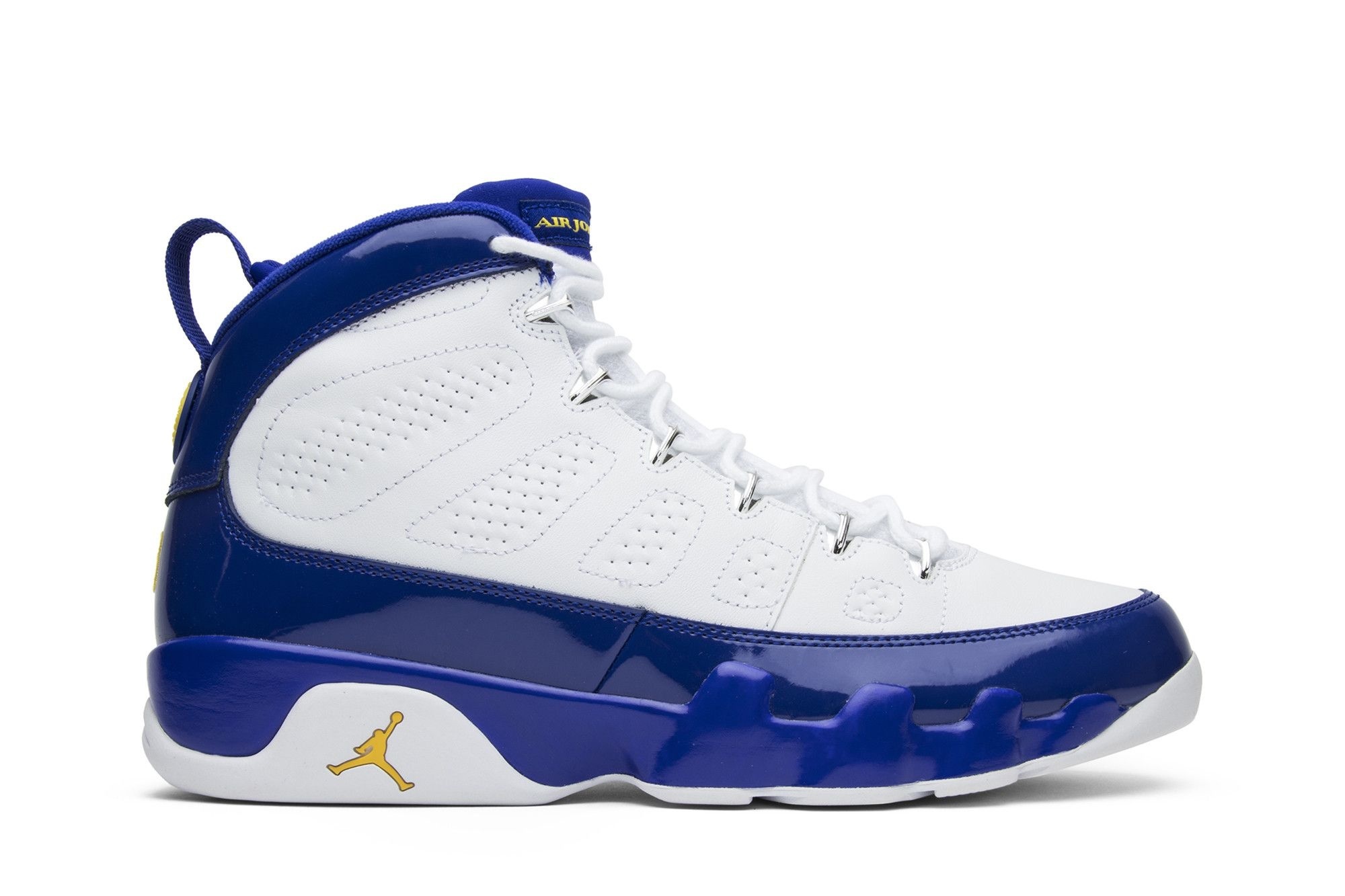 Air Jordan 9 Retro Kobe Bryant PE (302370-121). White/Concord-Tour Yellow. Limited edition sneakers blending iconic Air Jordan 9 design with Lakers-inspired colours. Premium leather, chrome accents. A collector’s item.