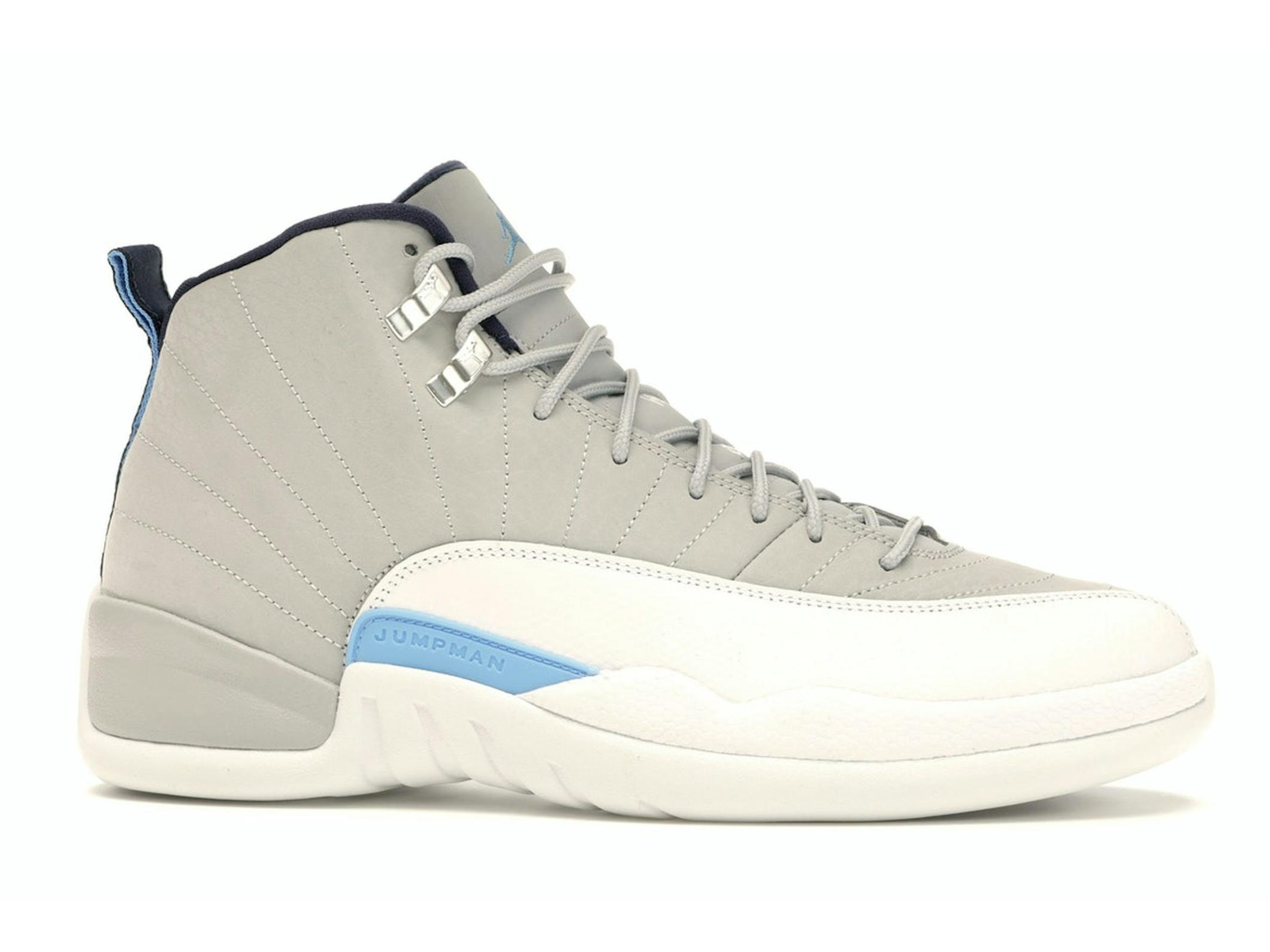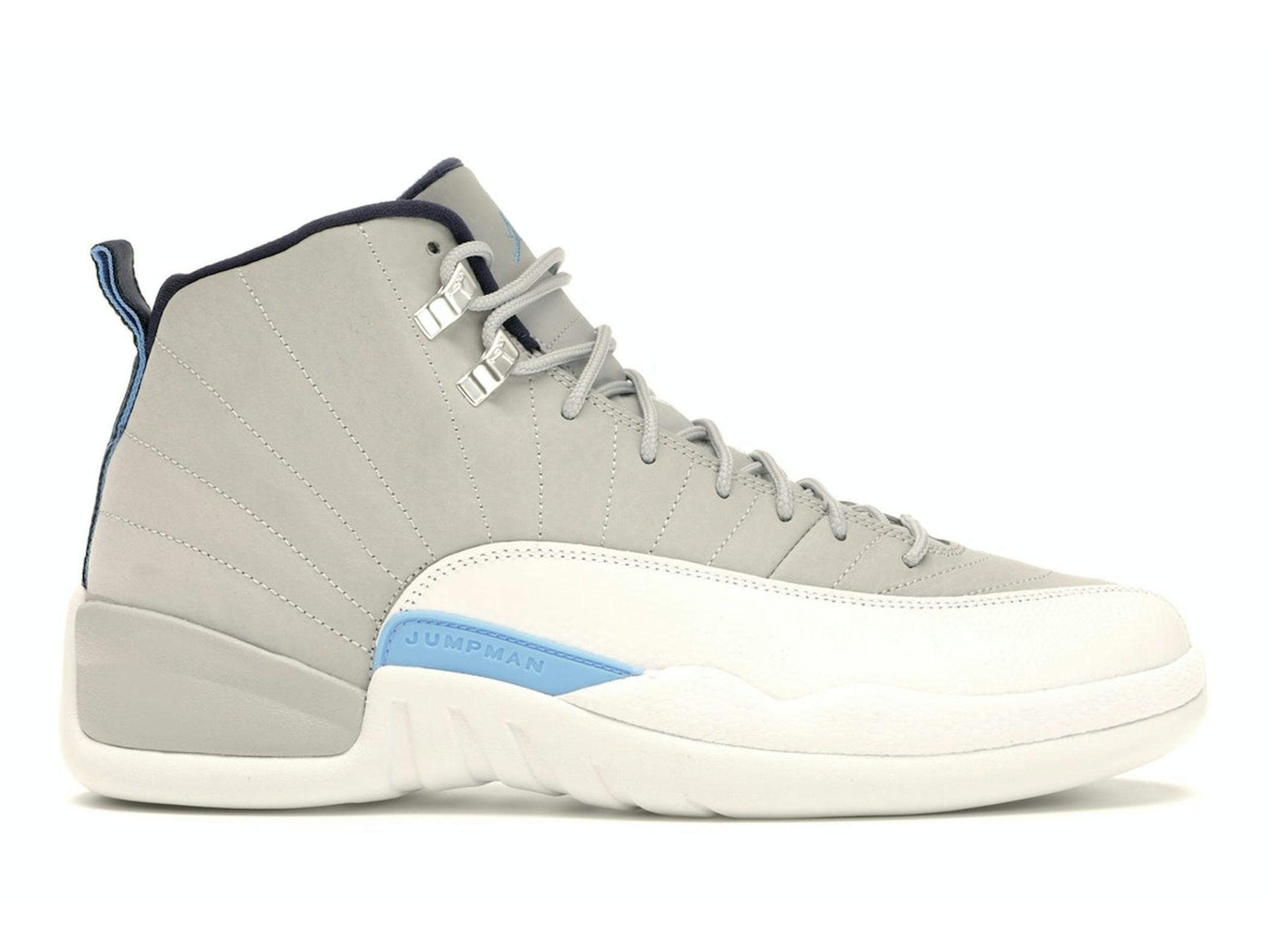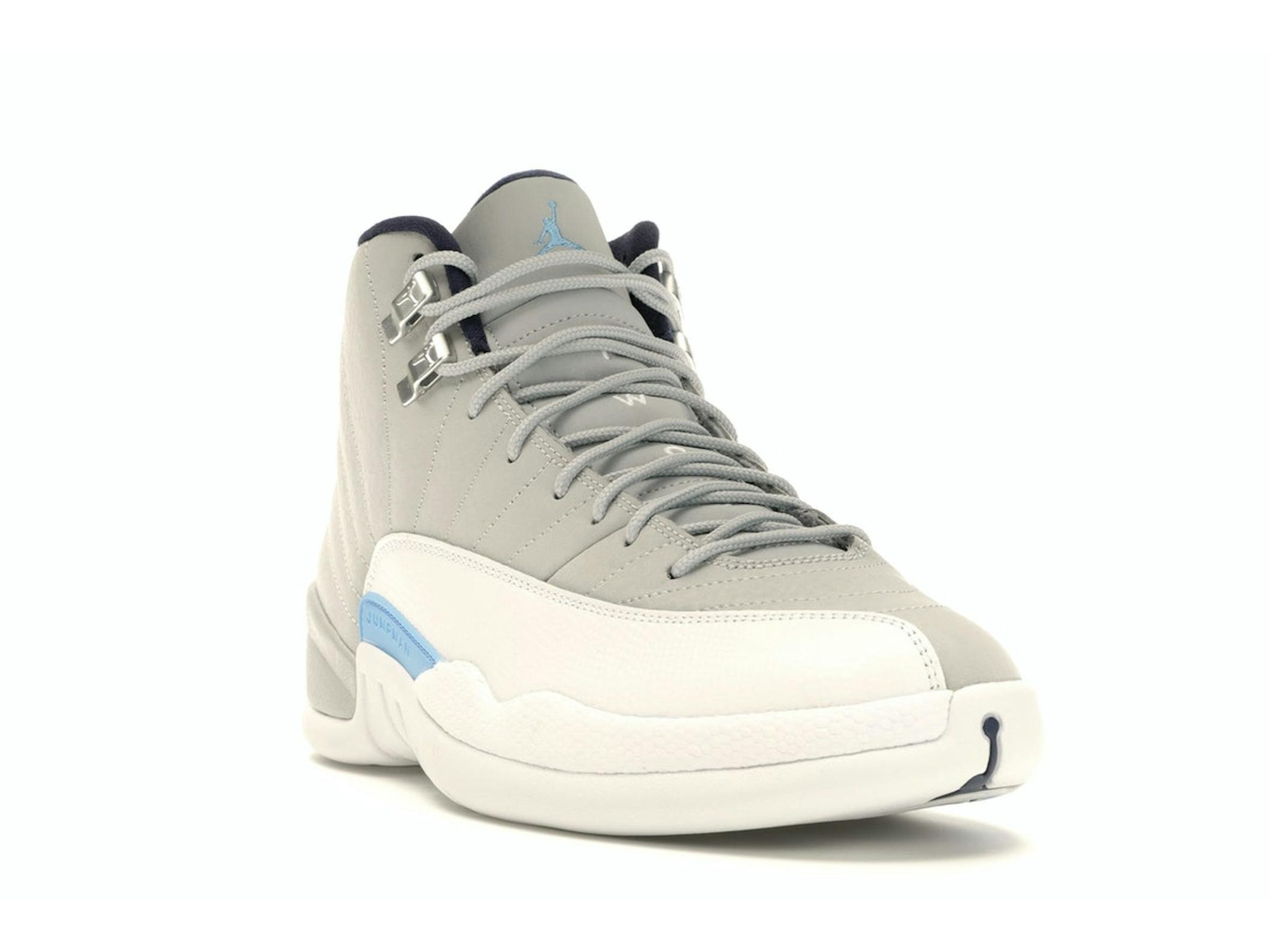 Jordan 12 Retro Grey University Blue (MPN 130690-007) sneakers. A classic Jordan Brand lifestyle shoe in Grey/University Blue-White.